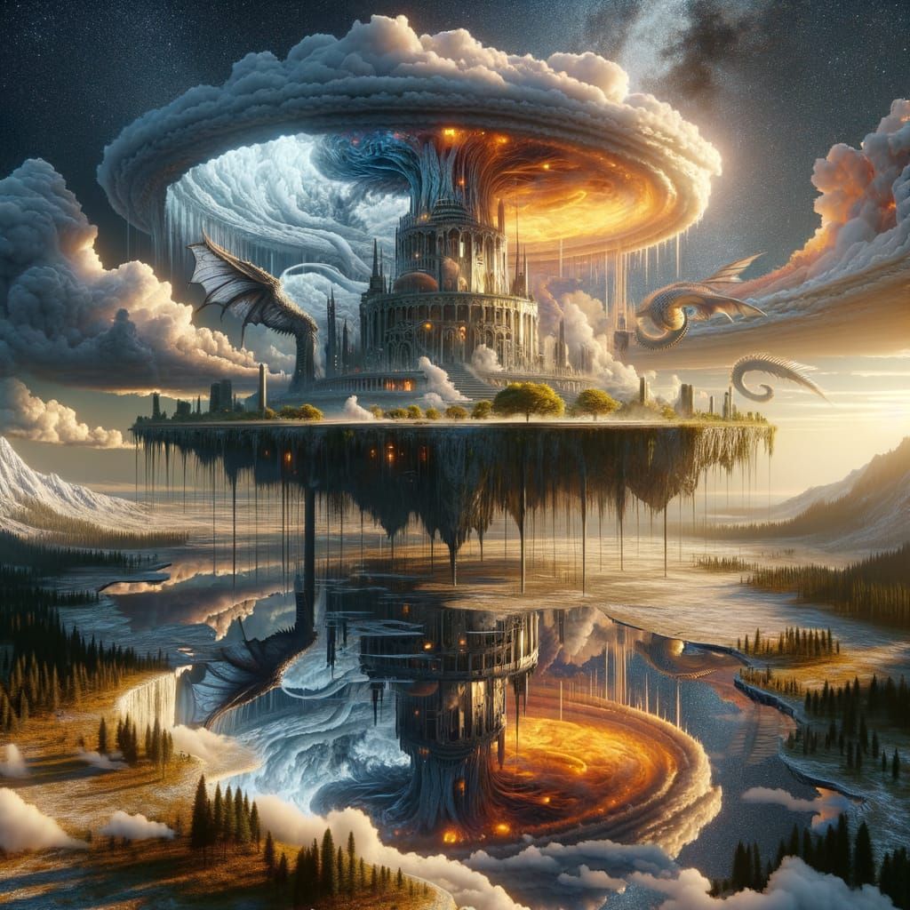 This image shows a necromancer's tower in a desolate yet beautiful landscape. The spectral sky features clouds that resemble two feuding dragons, mirroring reflections of the past, rendered in ultra-realistic 3D.