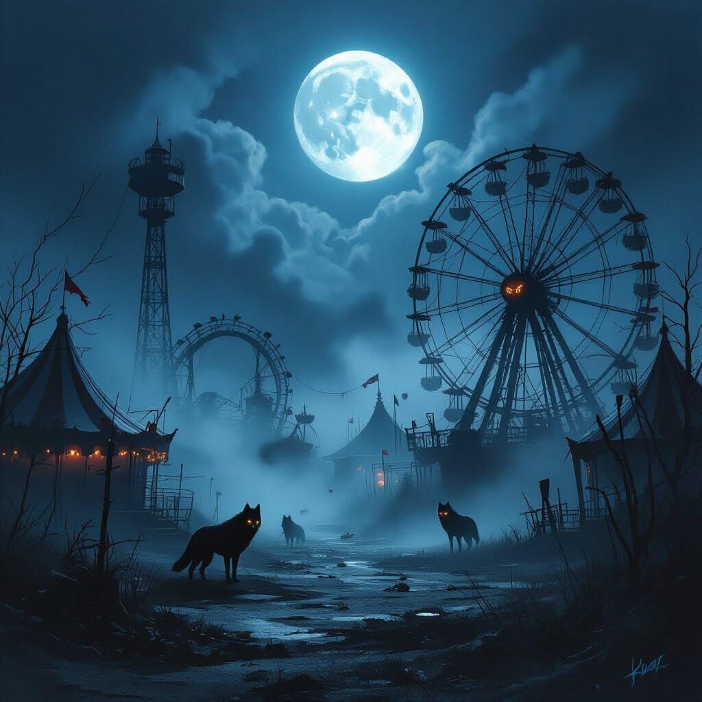 This image depicts a haunting abandoned carnival shrouded in thick fog under a full moon. Shadowy wolves with glowing eyes prowl the decaying grounds. The artwork is a dark, atmospheric digital painting with a desaturated palette and dramatic lighting.