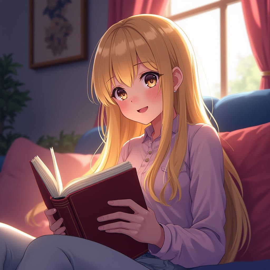 This image shows a cheerful 14-year-old blonde anime girl sitting in her cozy room, reading a book. The image features soft, cinematic lighting and a vibrant, cel-shaded style.