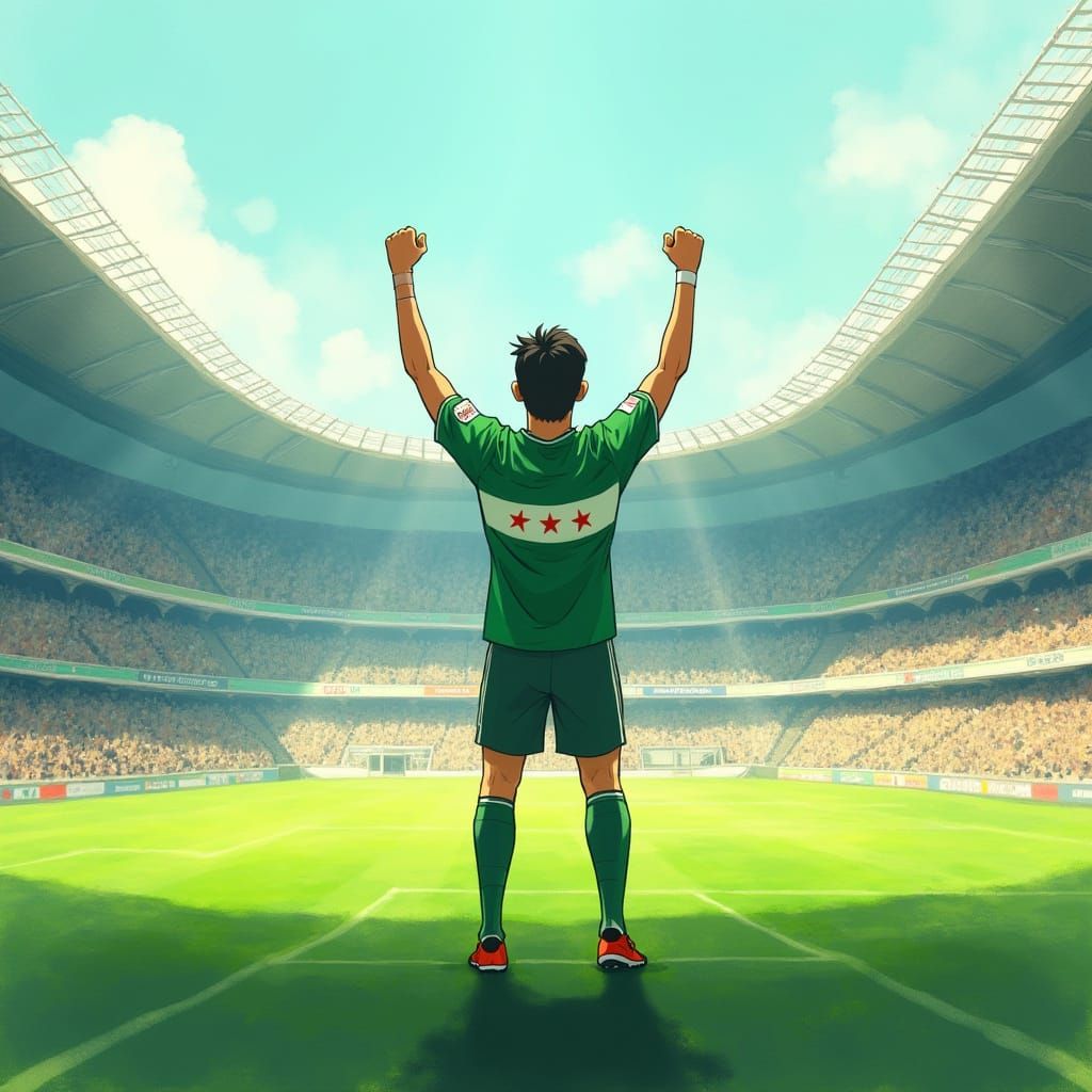 This image depicts a triumphant footballer in a vibrant green jersey, celebrating a goal at the iconic Bernabéu Stadium. The scene is reminiscent of a watercolor painting with subtle textures and soft light, evoking the style of Studio Ghibli's whimsical storytelling.