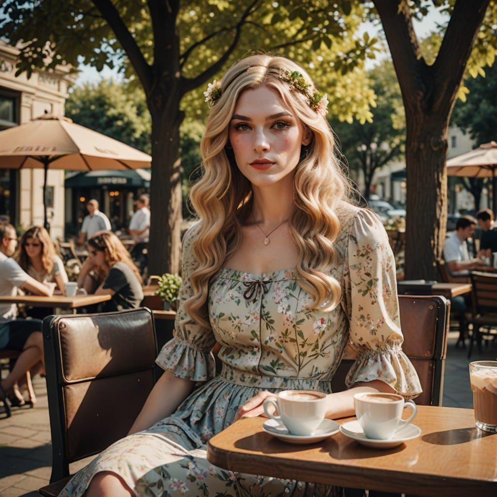 A cinematic film still capturing a young crossdressing man with blonde hair enjoying a latte at an outdoor cafe. Sunlight and warm tones create a nostalgic atmosphere.