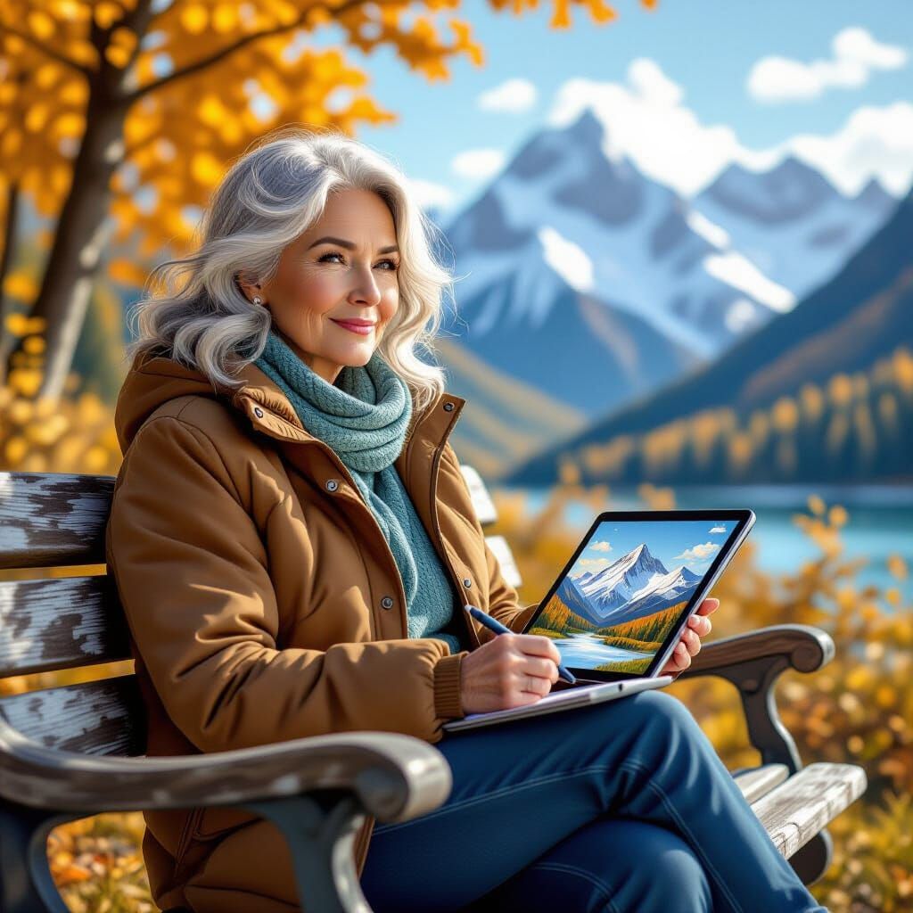 A 60-year-old woman with silver hair uses a tablet to draw a mountain landscape. She sits on a wooden bench in autumn sunlight, creating art with a digital stylus.