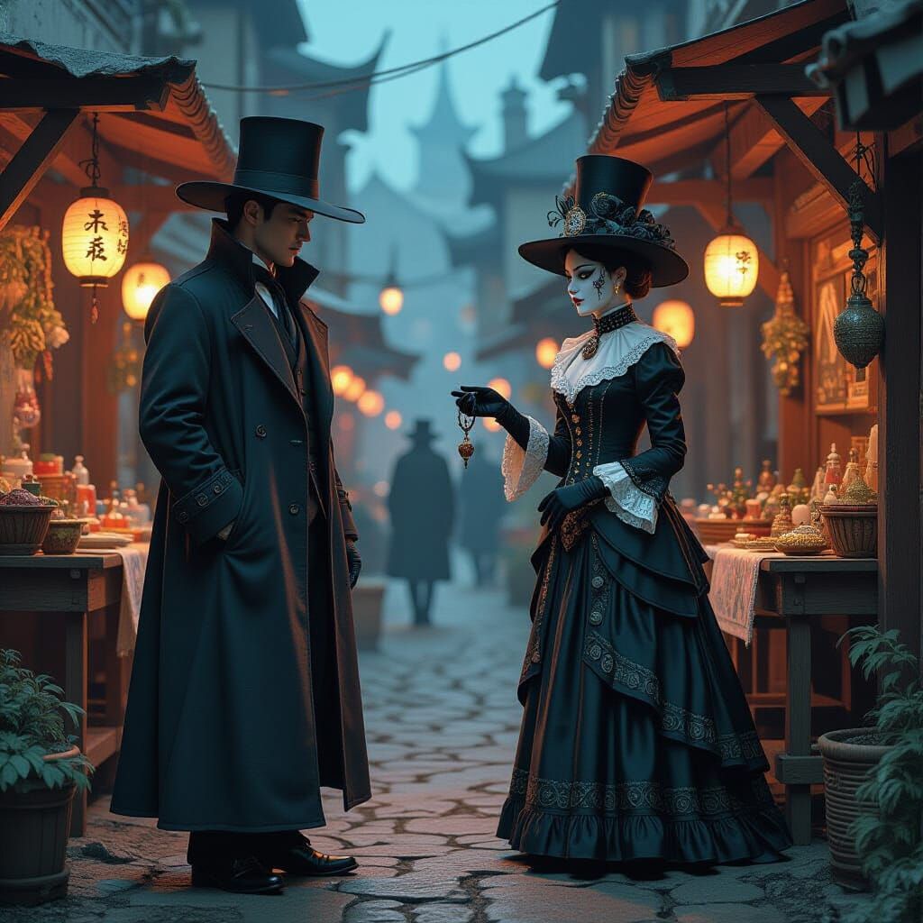 This image shows a human in unusual clothing exploring a clandestine night market inhabited by demons. A vendor in Victorian attire offers the human a protective charm with glowing runes in a dark, whimsical aesthetic.