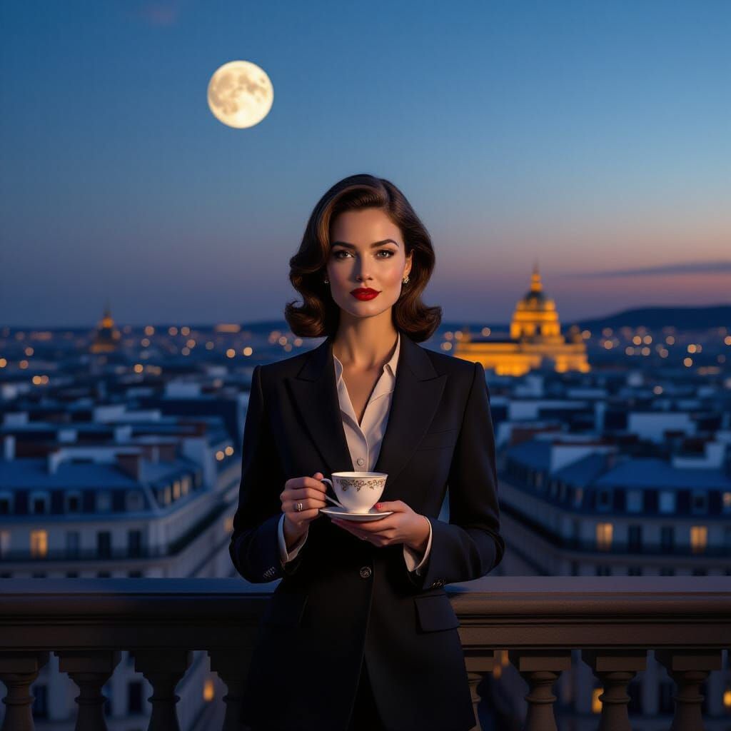 A sophisticated woman in vintage attire on a Parisian balcony at twilight, holding a teacup. This ultra-realistic photograph features cinematic lighting and surreal elements, evoking a romantic city glow with a film noir mood.