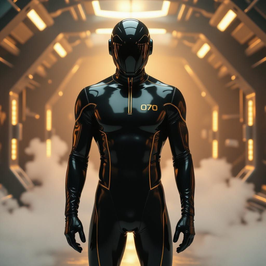 This image shows a male drone in a glossy black uniform with golden contour lines, reminiscent of Syd Mead's style. The setting is a mist-filled futuristic drone conversion room.
