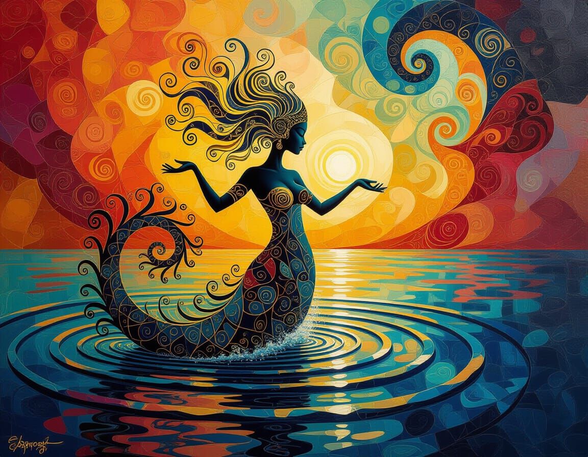 This surreal oil painting depicts a fluid water dragon dancing at sunset. Swirling colors and fractal patterns create a dreamy, otherworldly atmosphere with bold, abstract strokes.