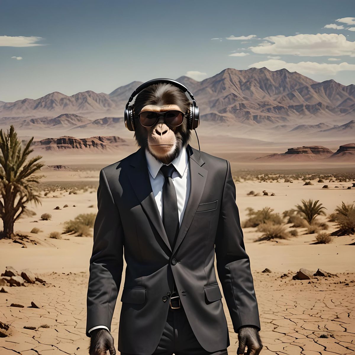 This image captures a photorealistic scene of a monkey standing alone in the desert, dressed in a dark business suit and wearing sunglasses and headphones, conveying a sense of serene isolation in a vast, empty landscape.