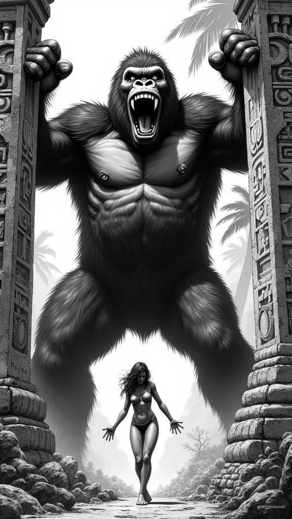 This image depicts a gigantic gorilla in a vintage comic book style illustration. The menacing creature towers over ancient ruins as a woman stands in a dramatic pose, shackled between pillars.