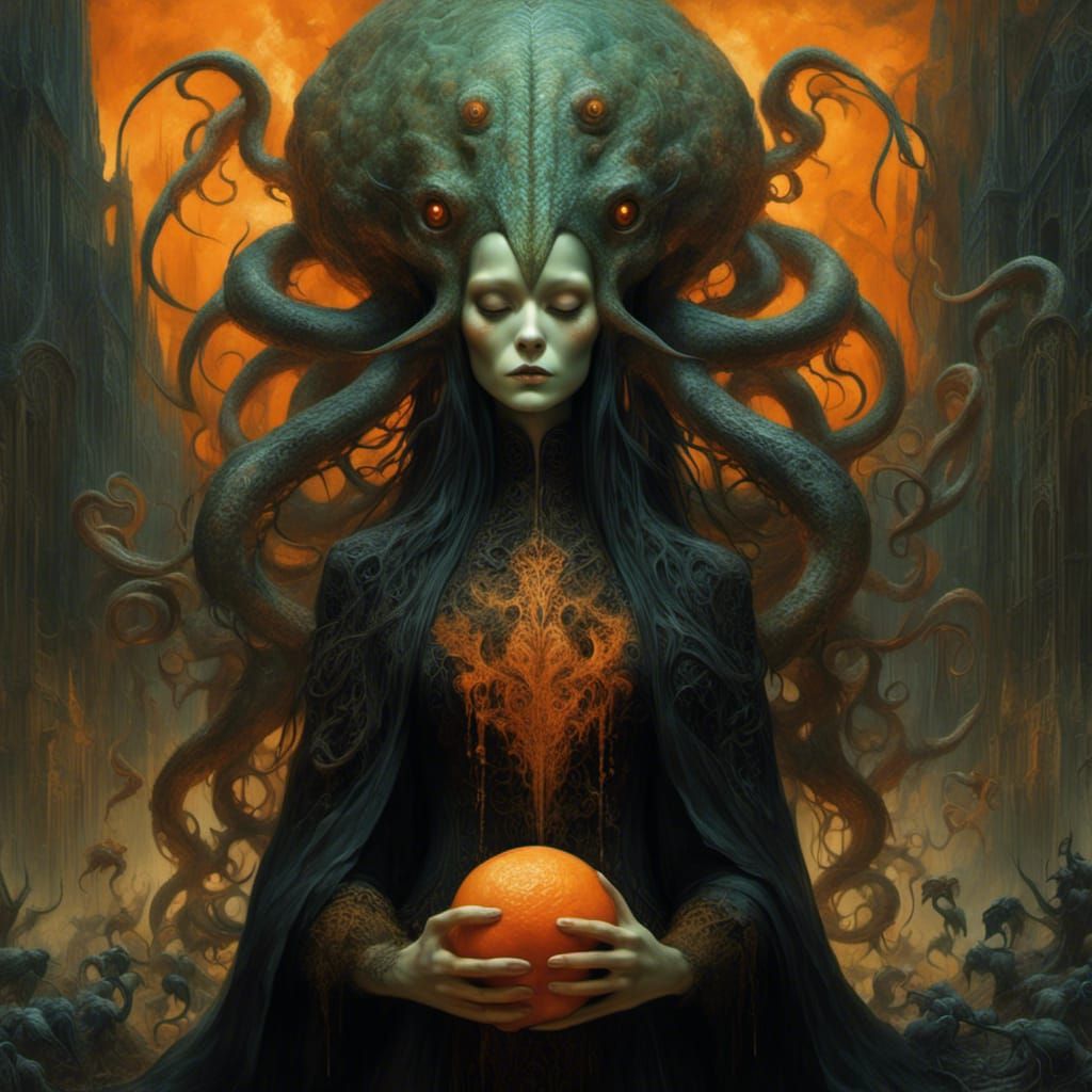 This image shows an album cover featuring Cthulhu in a surreal, dark, dystopian world. The artwork has a strong orange color palette and a surrealist aesthetic.