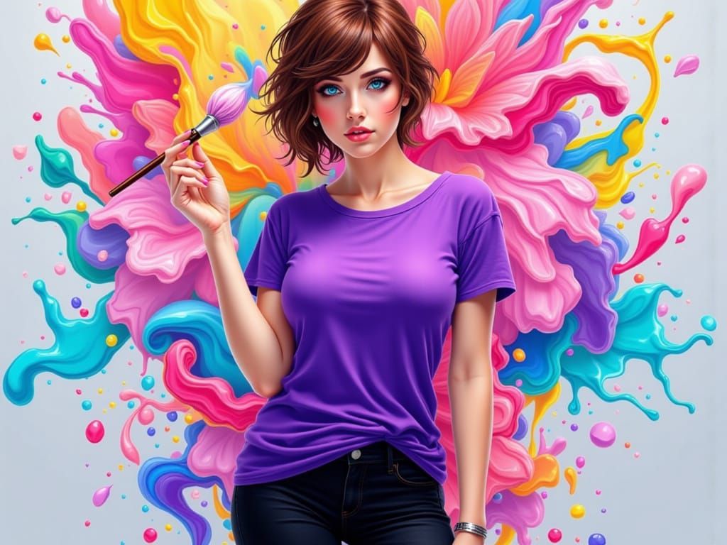 This image shows a realistic and detailed depiction of a voluptuous woman with blue eyes and short brown hair, holding a paintbrush against a vibrant, multi-colored splash paint background.