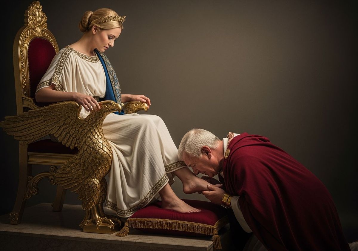 This image shows a Roman Empress seated on an eagle-shaped throne. A senator kneels before her, kissing her feet as she looks on with an angry expression. Photorealistic style.