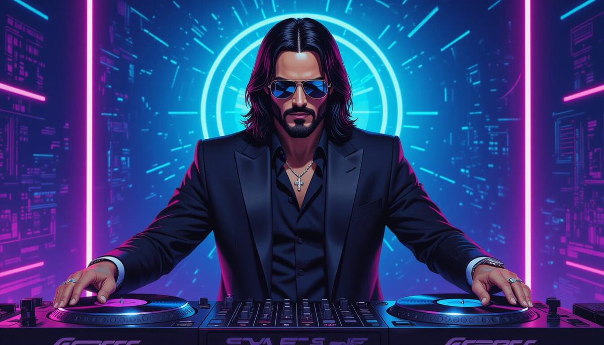This image shows Jesus as a DJ in a black suit and sunglasses, spinning vinyl records in a modern DJ booth. The artwork features a futuristic aesthetic with vibrant neon lights.