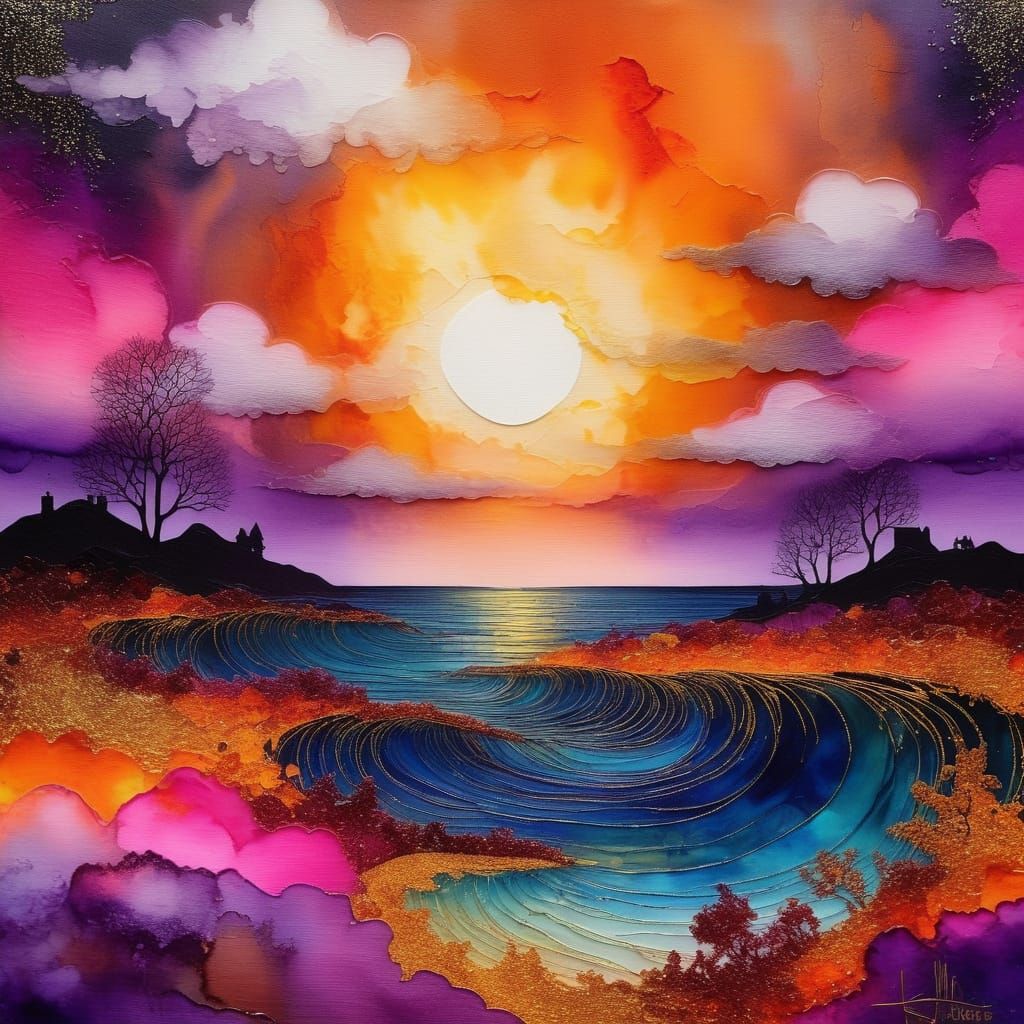 A vibrant image of a Gaulish village brought to life with vivid colors and intricate details. The artwork blends acrylic and oil techniques with glittering accents, set against an abstract sunset backdrop.