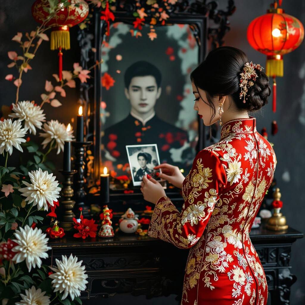 A poignant image of a woman in a red cheongsam at an altar. The scene, rich with Chinese ornaments, blends traditional elements with digital art in a haunting, mystical style.