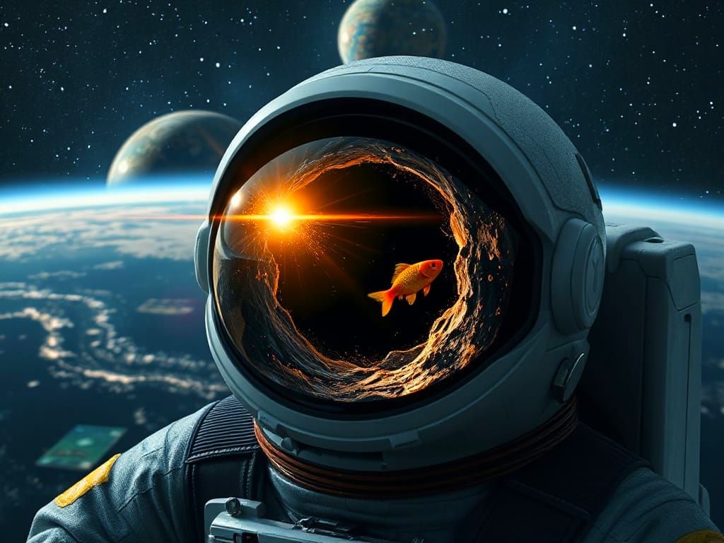 This image shows a lone astronaut's visor reflecting a cosmic black hole and a gold fish, set against a deep, starry sky. Rendered in a detailed, cinematic style with intricate details and vivid colors.