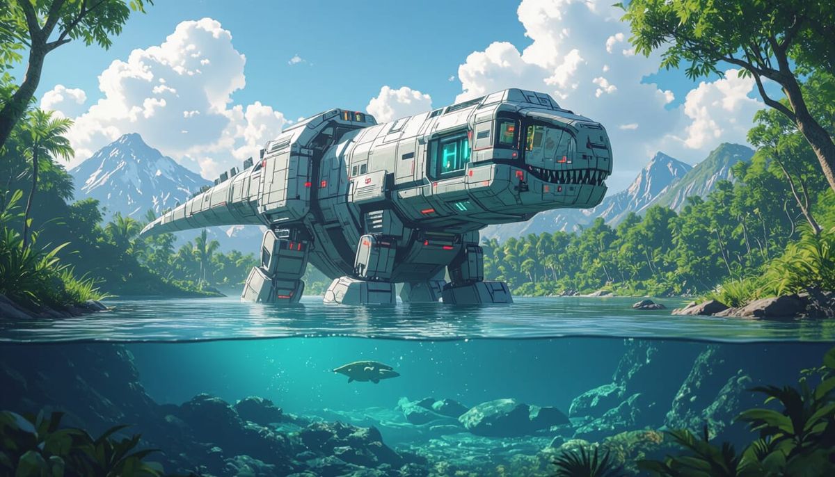 A futuristic cityscape meets prehistoric life as a sauropod emerges from clear waters. Lush jungle and mountains frame this scene, rendered with contrasting colors and hyper-realistic textures in a cyberpunk aesthetic.