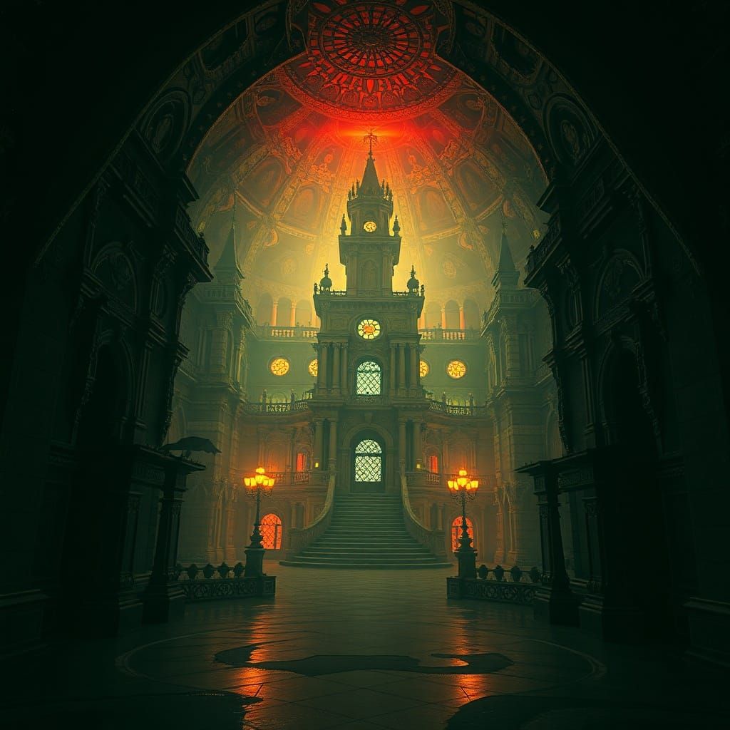 This image depicts a foreboding palace of hell with intricate details and haunting contrasts. It features dramatic lighting and a desaturated, high-contrast aesthetic, rendered in a surreal style.