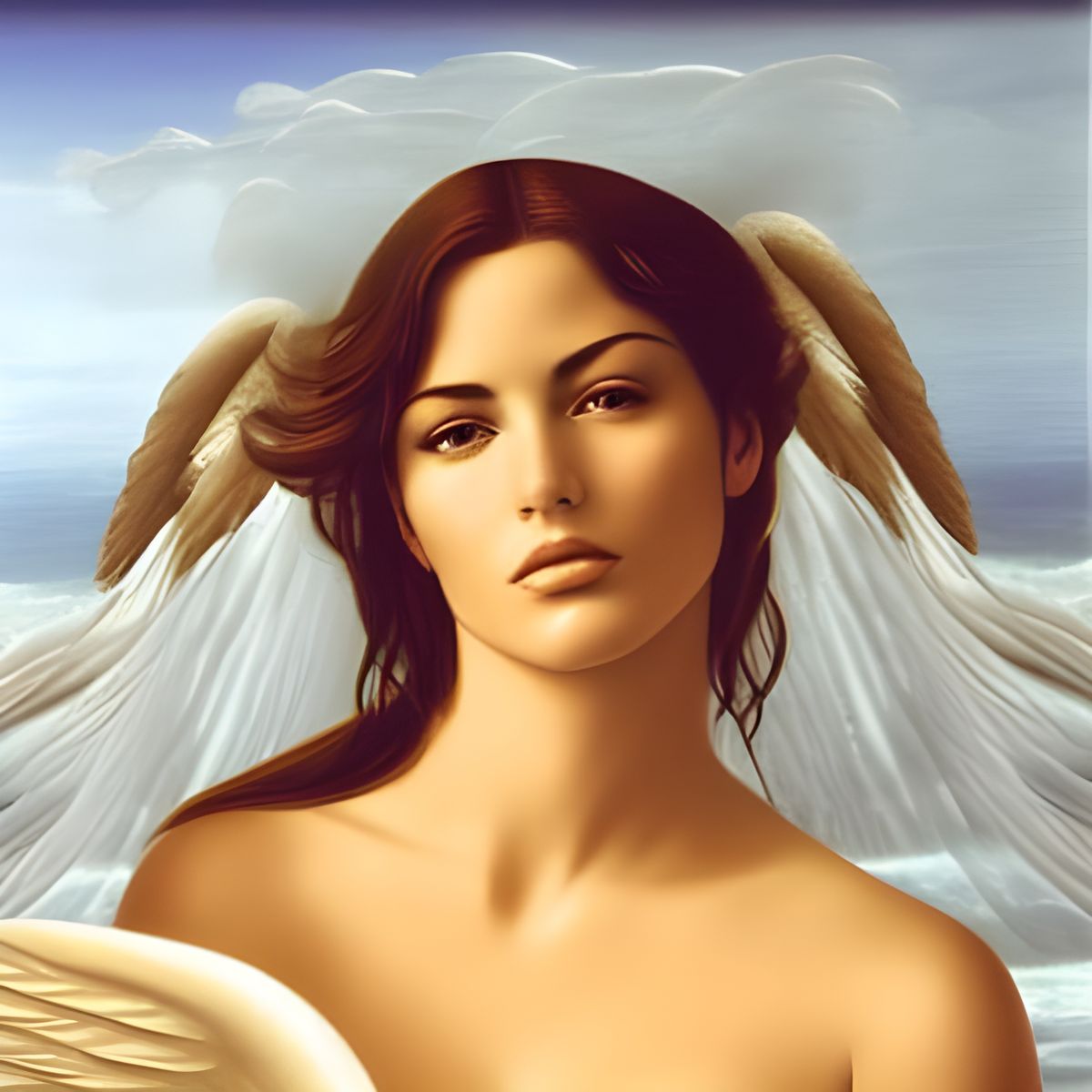 A hyperrealistic photograph inspired by Botticelli's Birth of Venus, featuring Monica Bellucci emerging from high waves, surrounded by flying angels. The image shows a modern take on the classic scene.