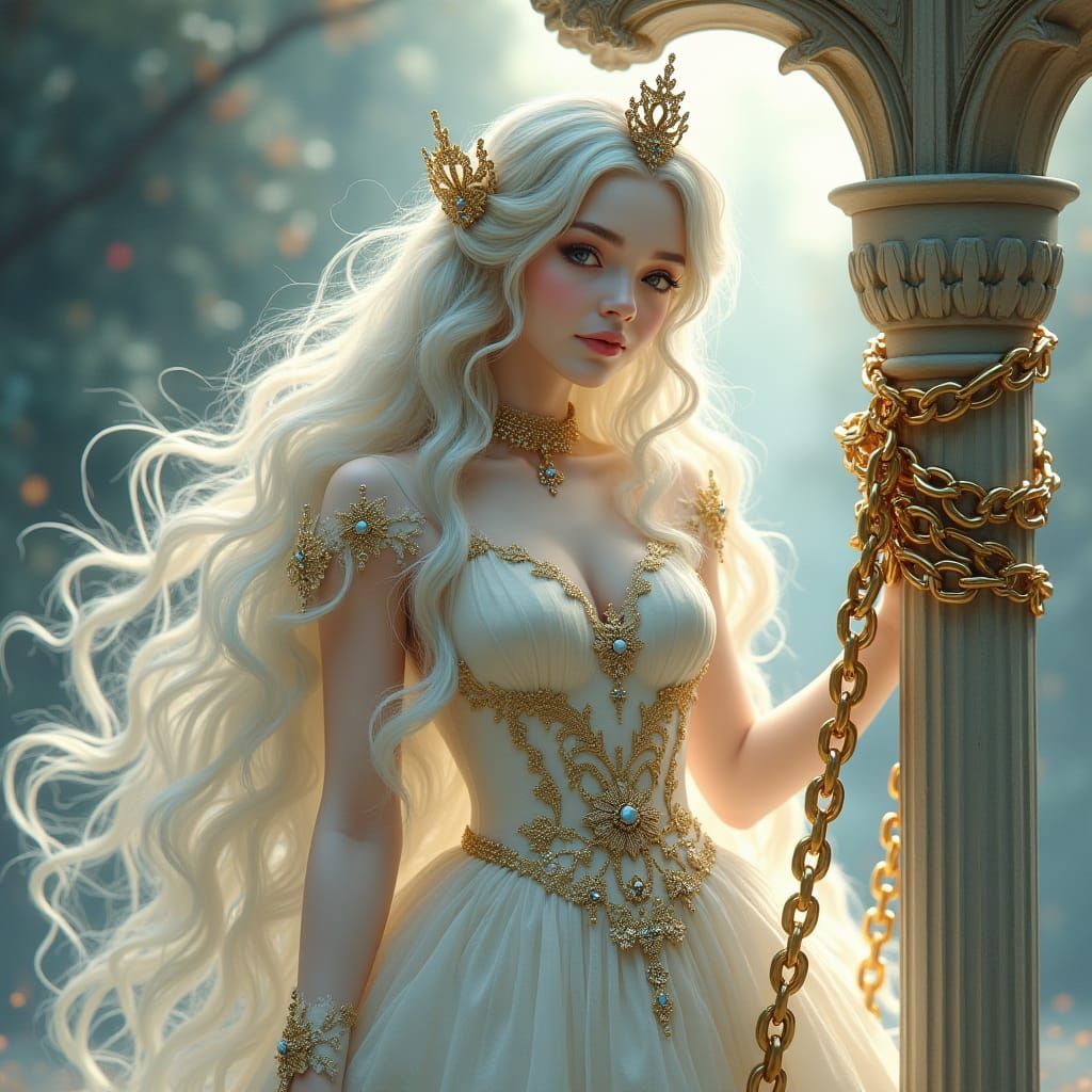 A digital artwork of a beautiful princess chained to an ancient stone cross, bathed in ethereal light. She is adorned in a white and gold gown with jewels, rendered in vibrant, fantastical colors.