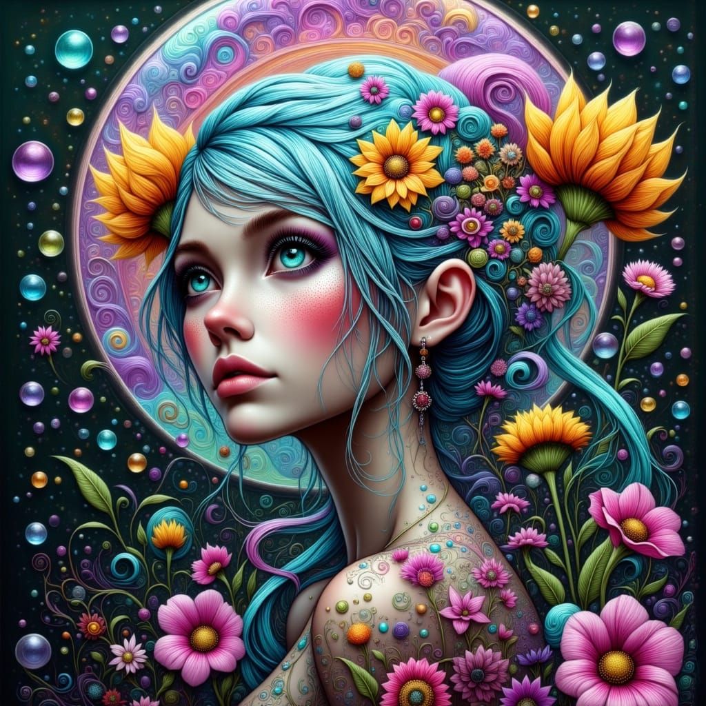 This image shows a beautiful fairy woman among raindrops and bubbles. The composition incorporates neon colors, flowers, and glass elements in a graphic, detailed, and whimsical style.