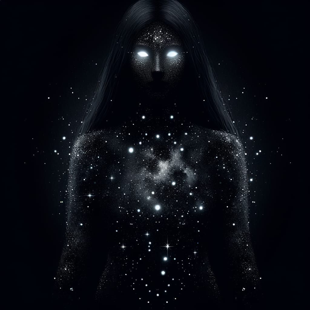 This image shows a night goddess formed from shadows and stars, merging with the dark sky. Her eyes glow intensely, and her intangible voice creates visibility.
