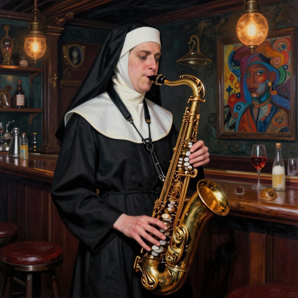 This image shows a Roman Catholic nun playing a saxophone in a dimly lit bar. The artwork features complex details, deep colors, and an atmospheric masterpiece composition, rendered in a maximalist style.
