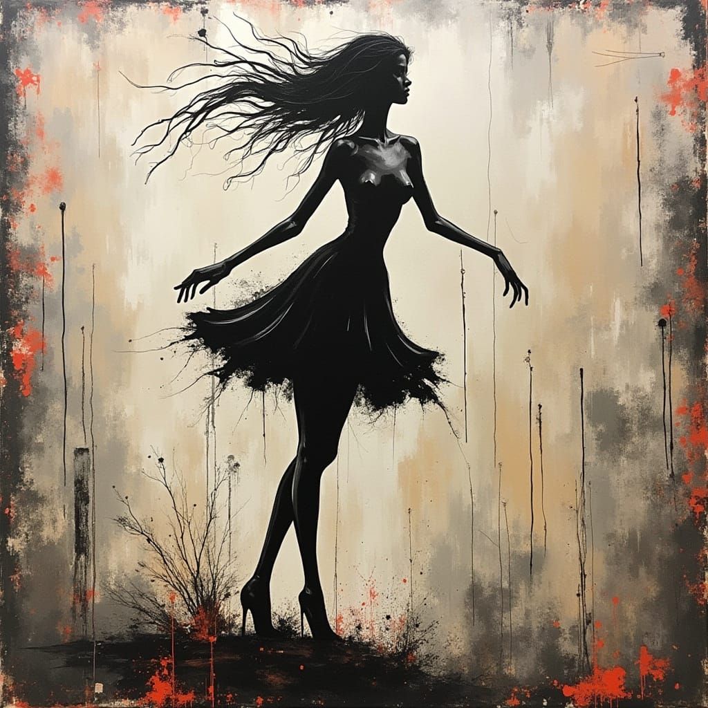 This image shows a Banksy-style metal woman with elongated limbs in a chaotic abstract expressionist atmosphere. The artwork features vibrant, expressive brushstrokes in monochrome.