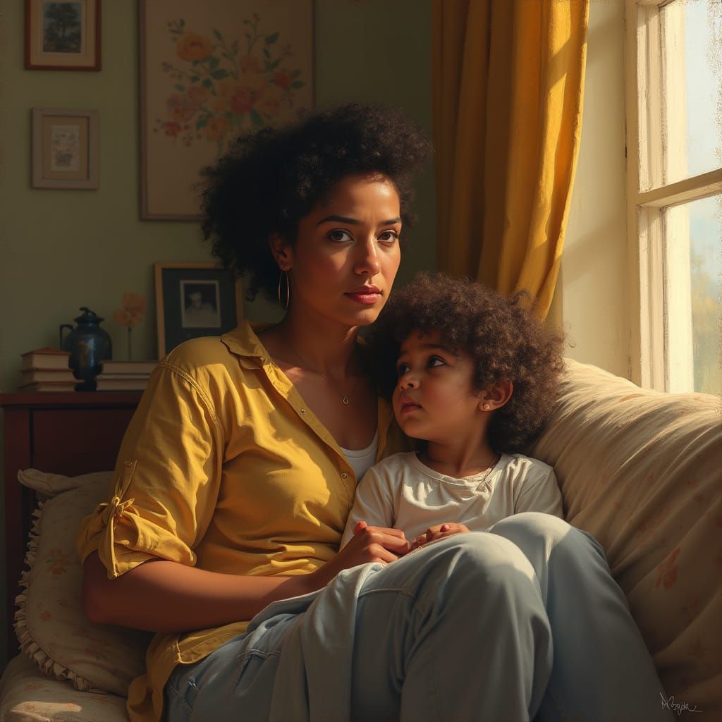 This image shows a mother contemplating her children's future in a cozy room. The artwork's soft lighting and expressive brushstrokes evoke a feeling of warmth, hope and concern.