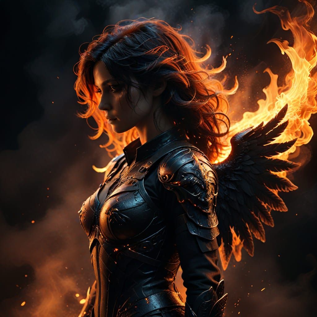 A dramatic close-up of a dark angel in profile, fists clenched against an inferno backdrop. The image features dynamic lighting, smoke effects, and a bold contrast between vibrant oranges and deep blacks.