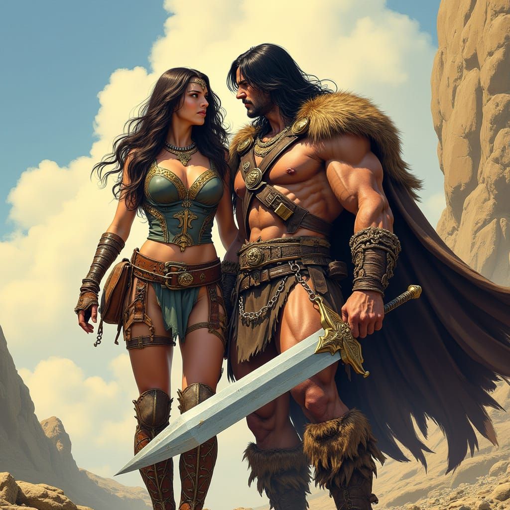 This image depicts Conan the Barbarian and Hawkgirl standing together in a rugged landscape, rendered in a comic book art style.