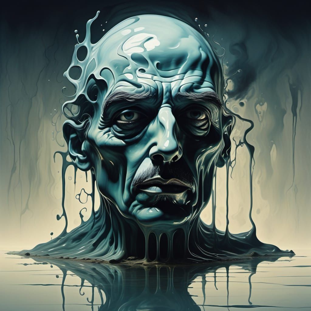 This surreal artwork features a distorted, melting figure with an eerie atmosphere, reminiscent of Salvador Dali's dreamlike paintings.