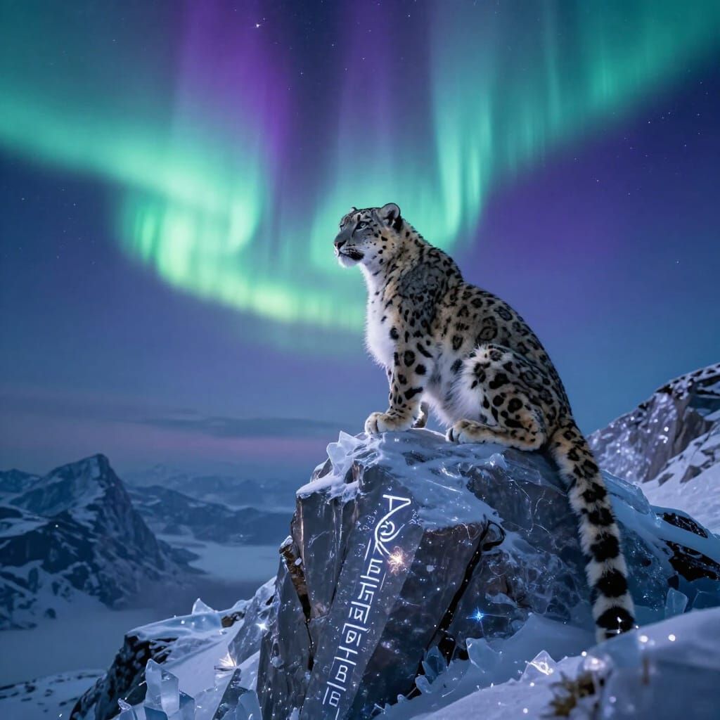 This image shows a snow leopard on a crystal mountain peak under vibrant auroras. Ethereal moonlight casts shadows on icy rocks with glowing runes. Intricate fantasy concept art style.
