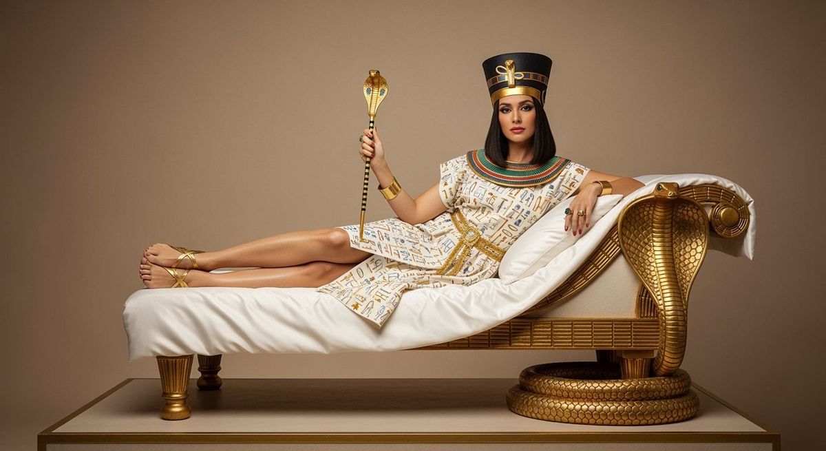 This image shows the Queen of Egypt reclining on a golden chaise lounge atop a dais. She wears a gold toga and cobra crown, holding a scepter in a photograph with a bokeh effect.