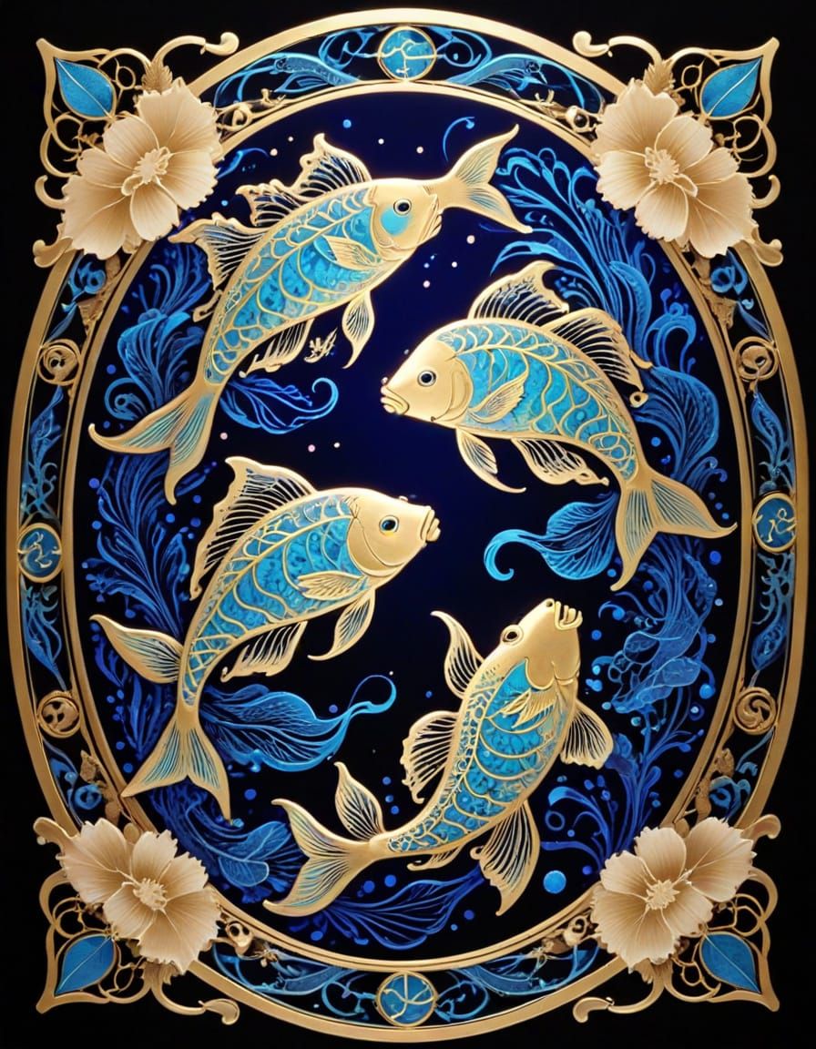 This image depicts two fish in opposite directions, representing the Pisces zodiac sign, in a luxurious art deco style with intricate 24-karat gold filigree details that glow under UV blacklight.
