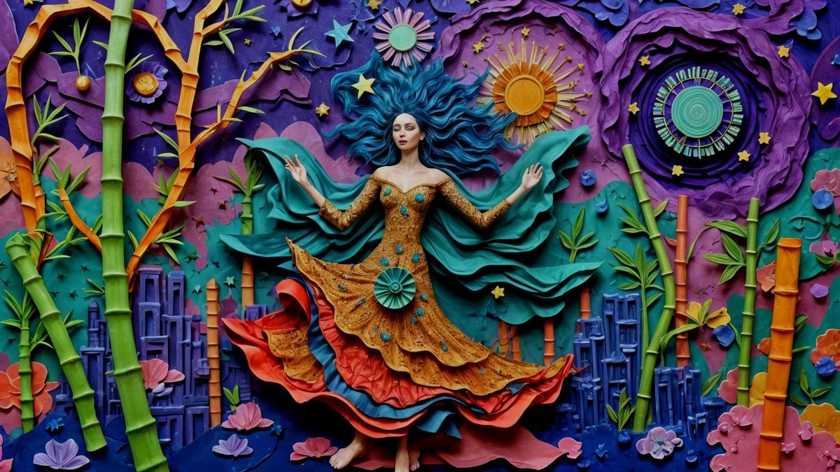 A surreal image of a starlight spirit dancing in a bamboo forest high above a city. The scene is set against a swirling, starry night sky, rendered with a papercut aesthetic.