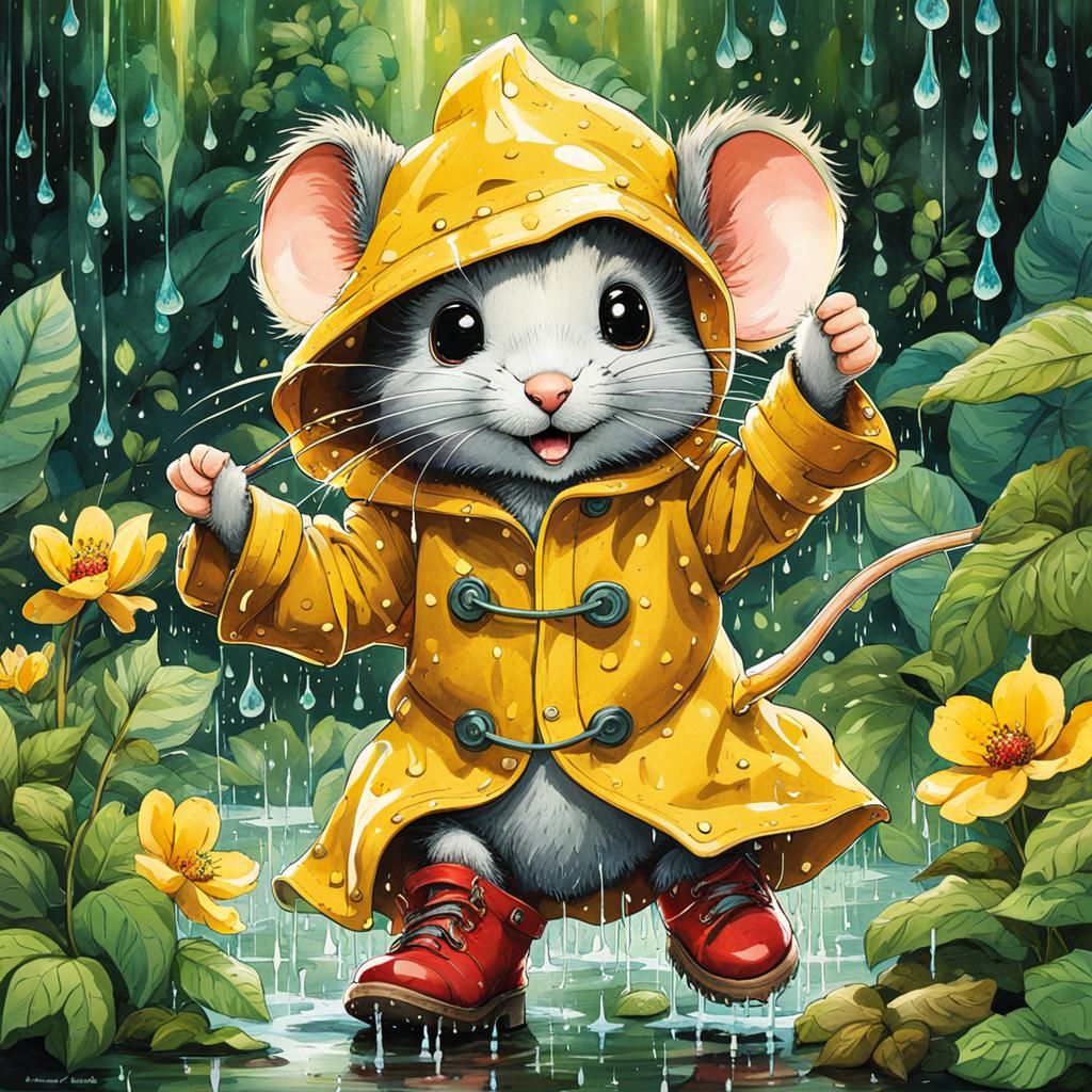 Insanely detailed digital watercolor illustration of The happy Adorable chibi mouse wearing a yellow raincoat and red wellington boots dancing in the rain in the garden, rain drops, splashes, triadic colors, 8k resolution, by Alice Pasquini, Brian Kesinger and Bridget Bate Tichenor, dense, wet, joyful, ...