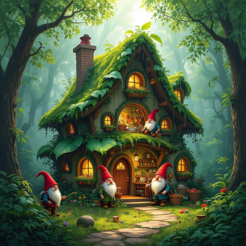 This photorealistic image showcases a vibrant fantasy house deep in a forest, with gnomes tending to chores under oversized leaves. Sunlight filters through the dense canopy, illuminating the detailed, colorful concept art.