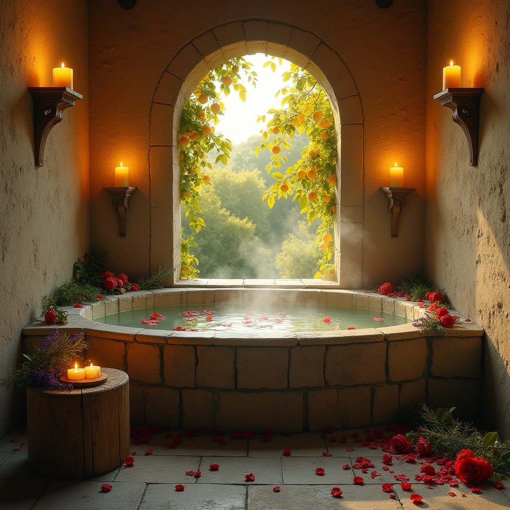 Create authentic medieval-inspired bath scenes with our free AI image generator, featuring warm golden light and ornate details.