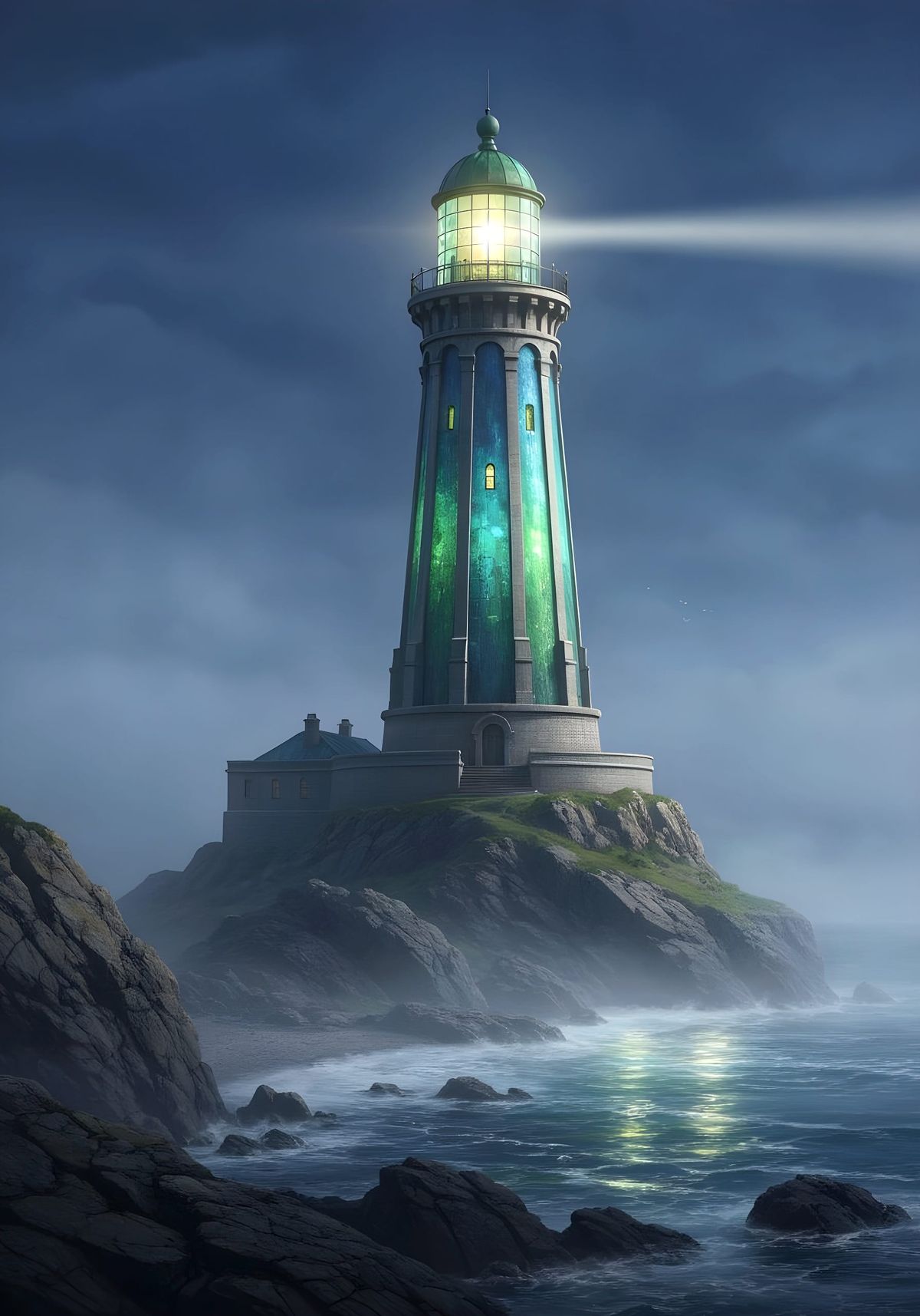 A detailed illustration of a lighthouse made of sea glass, set against a rocky coast with shimmering water. Features fantasy concept art and matte painting styles with deep, complementary colors.