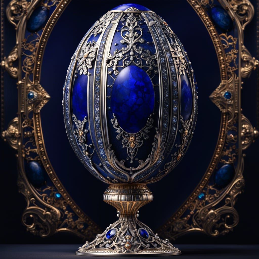 A digital matte painting showing a Fabergé egg decorated with lapis, silver, and sapphires. The cinematic composition is intricate, detailed, and maximalist.