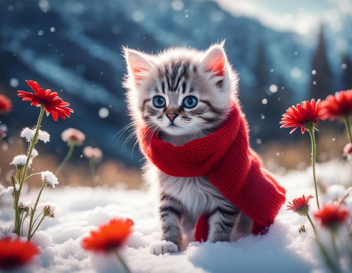 A hyperrealistic portrait of an adorable Ragdoll kitten with big eyes, wearing a red scarf, standing in a snowy field with wildflowers and mountains under the northern lights.