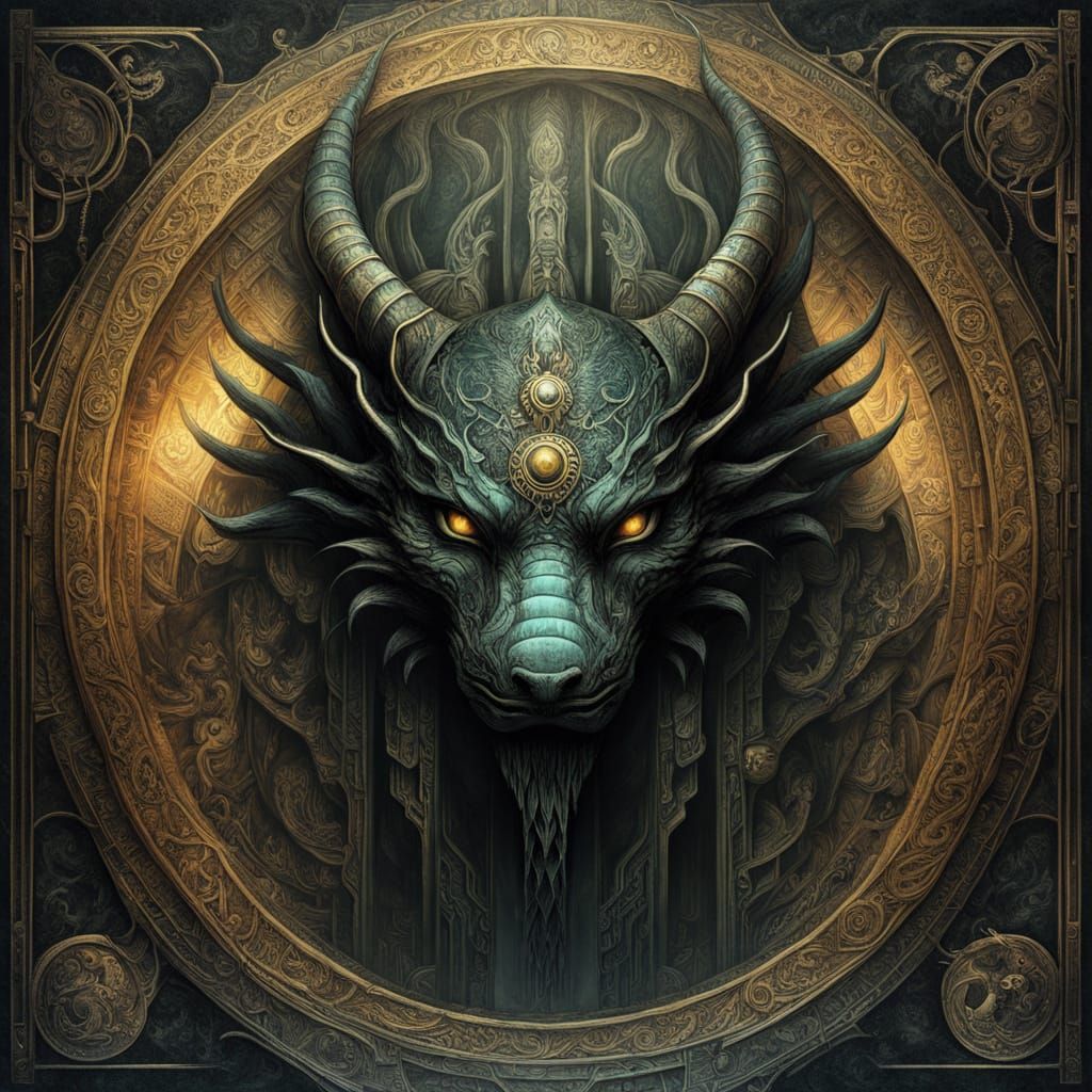 A striking picture of an ancient cultic wall adorned with frescoes depicting melting lead, a dragon, and a human embryo. The scene is rendered in a biomechanical, H.R. Giger-inspired style with glowing gold accents.