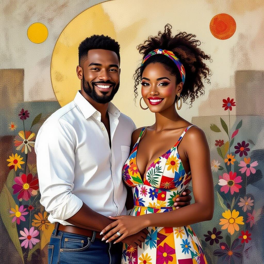 This image shows a handsome man and a beautiful Black woman embracing warmly. She wears a vibrant dress, and he wears a white shirt and jeans. The scene is brightly lit with a cozy, inviting atmosphere, in an expressionist style with African pattern influences.