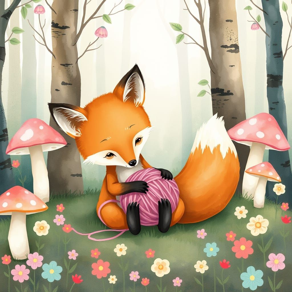 A charming watercolor illustration of a fox kit frolicking in a magical forest. Pastel flora and fauna enhance the dreamy, surreal scene. The art style evokes children's book illustrations.