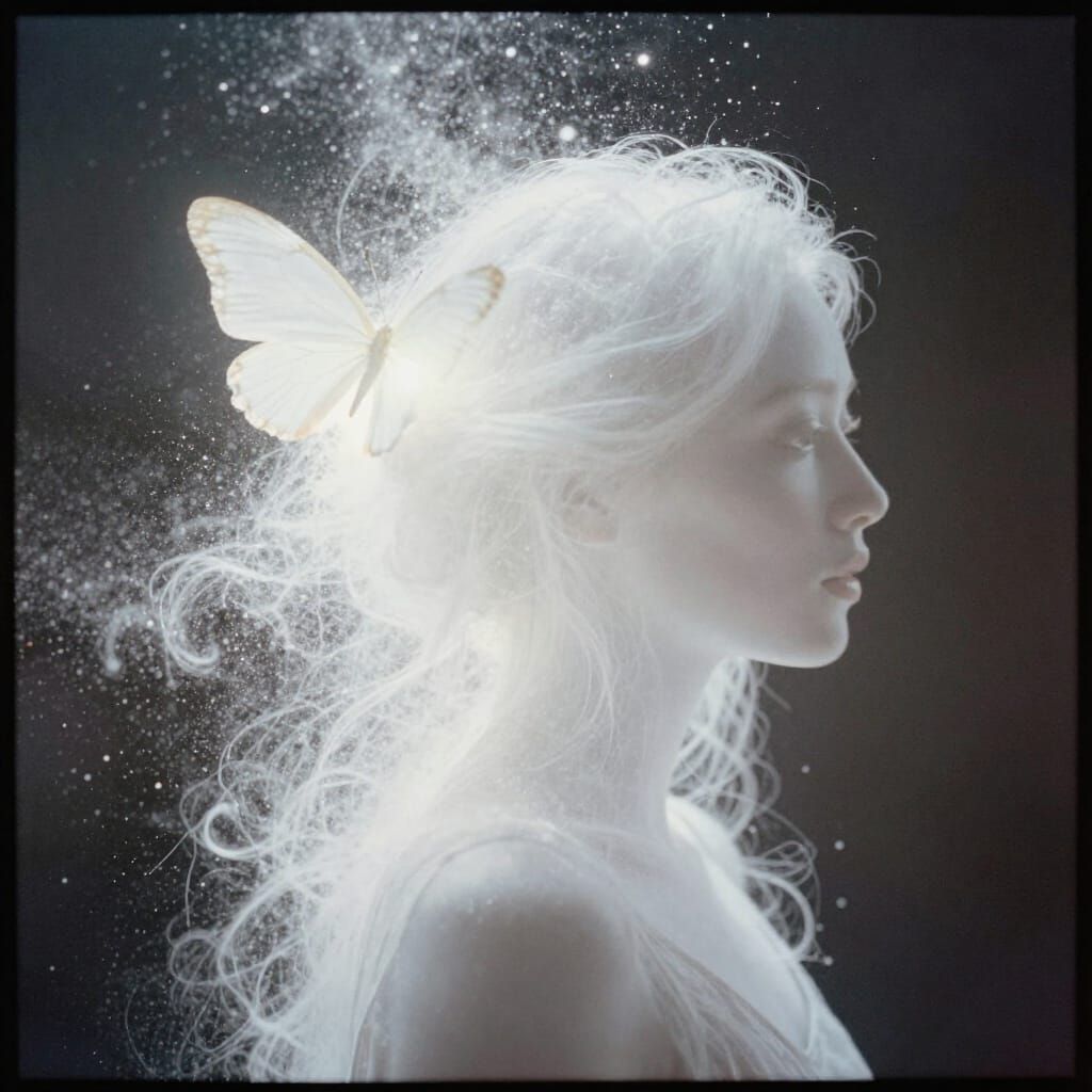 This image shows a human form gracefully transforming into luminous particles, guided by a butterfly. A cinematic film still with a soft glow and subtle contrast, evoking rebirth.