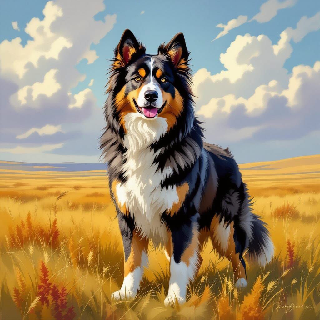 A striking picture of a Central Asian Shepherd Dog standing in a steppe. The image features realistic textures and atmospheric lighting, with artistic inspiration from wildlife art and surrealist painting.