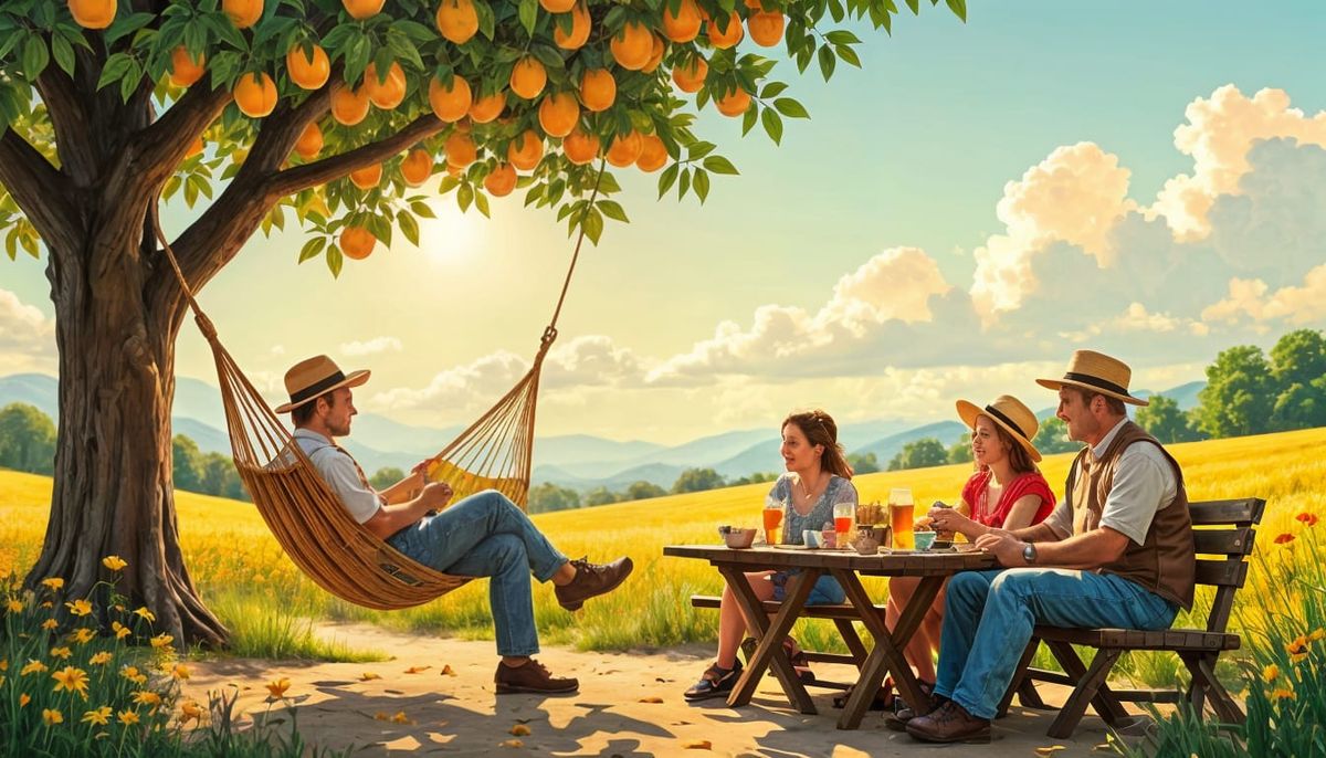 This image shows a split scene contrasting lifestyles. On one side, a Costa Rican farmer relaxes in a hammock, while on the other, a Bavarian family enjoys a beer garden in warm earth tones.