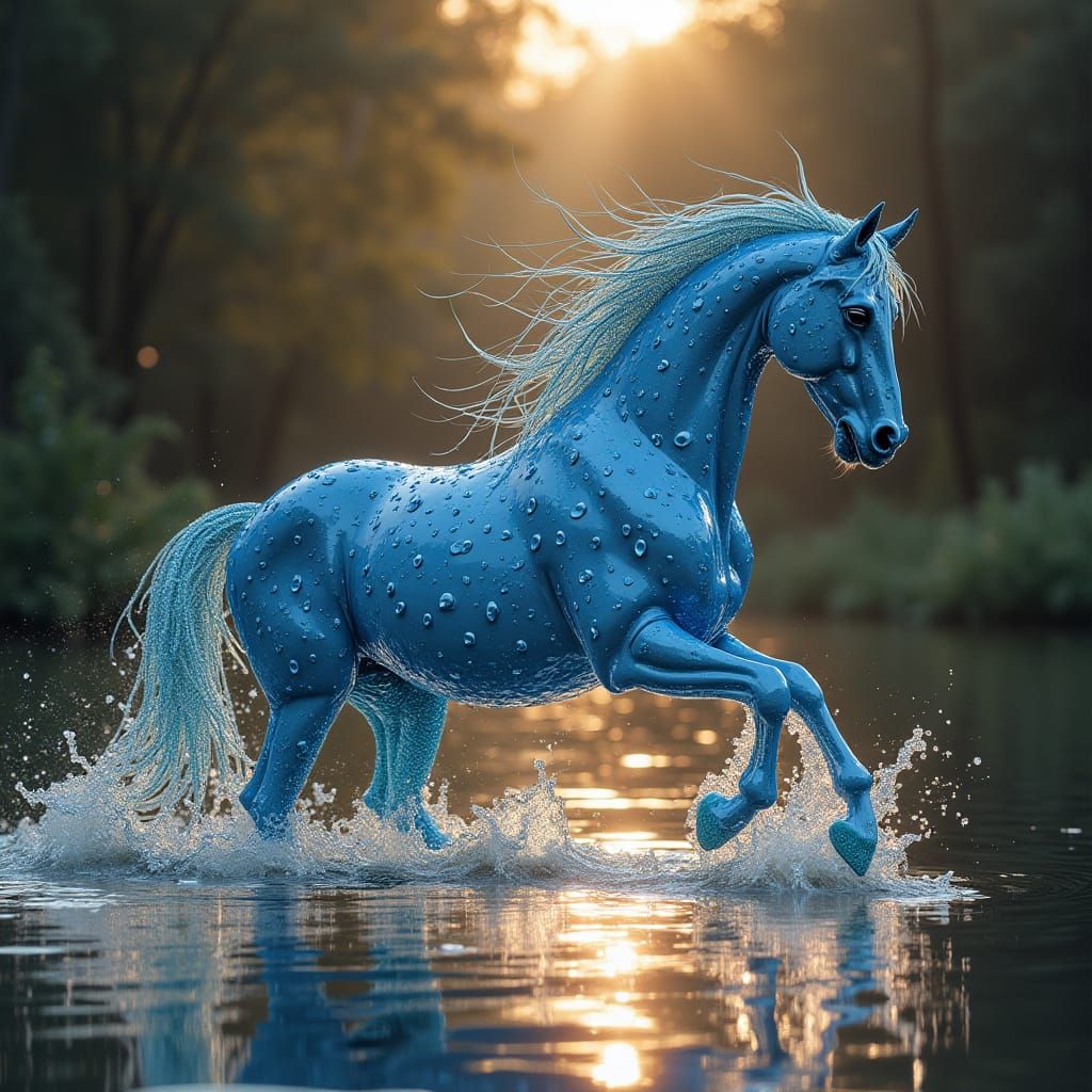A surreal image of a blue horse formed from moving water. Soft, ethereal lighting enhances the dreamy quality of this digital artwork against a clean white backdrop.