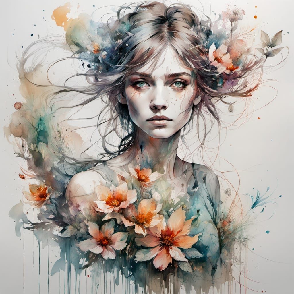 This image shows a beautiful forest spirit woman composed of flowers scattering in the wind, with vines on her arms. Features a crisp face with an ink outline and a collage of flowers.