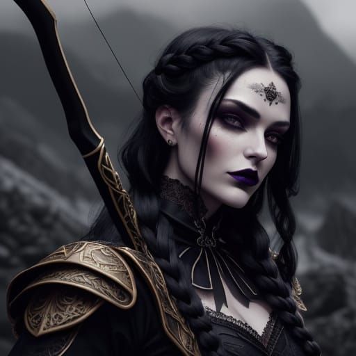 A close-up portrait of a female archer in a dark, mountainous landscape, aiming her bow and arrow. The image is in the style of dark romanticism with dramatic lighting and intricate details.